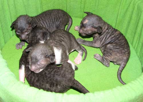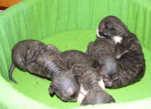 Rytmiksen ja Reiskan pennut, syntyneet 23.7.2006. Kuvat otettu 2.8.2006, joten pennut ovat 1,5 viikkoa.