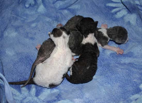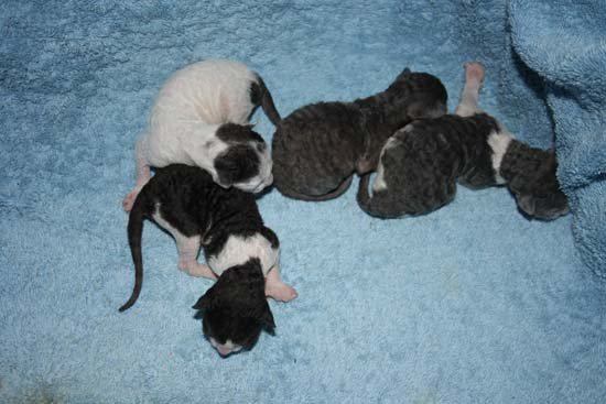 Pennut 4 viikon ikäisinä. Kuvissa myös mamma Rassi ja pentujen täti Rulla. Rassi ja mustavalkoinen tyttö