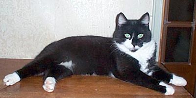 Brutus is born at the same Heikkilä's crab-farm as Borisand Doris and they are probably somewhat related. Both Brutus and Boris have totally tailless mothers and in that farm they have tailless or half-tailed kittens every year. So Brutus is originally an ordinary housecat, although without a tail. Brutus had one tailless brother, Bill, and we wanted to take them both. Unfortunately Bill died accidentally just before we went to get them. When Brutus was growing up, all the time we waited to see if he will look like a manx or not. Just after his 10-month birthday Brutus entered a cat show in novice-class and was accepted as manx in 5.3.2000 in Järvenpää. After that he has been shown a couple of times and he has got his certificate every time. Like a genuine manx, Brutus is quite short and heavily build. He is black and white, with only little bit of white. Brutus is a real trouble-maker, whose main hobby is to force his way through to places he is not supposed to go at all. Luckily he is a very kind and friendly cat and you can never be angry with what he has done again. Brutus has the funny way of jumping around like a bunny, just like a real manx should do. Brutus got kidney failure and was put to sleep 2009. |