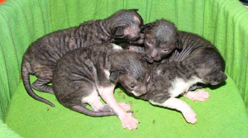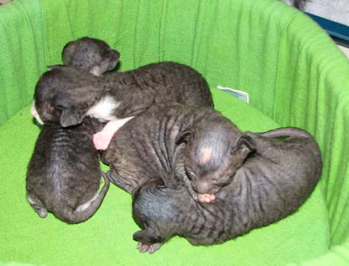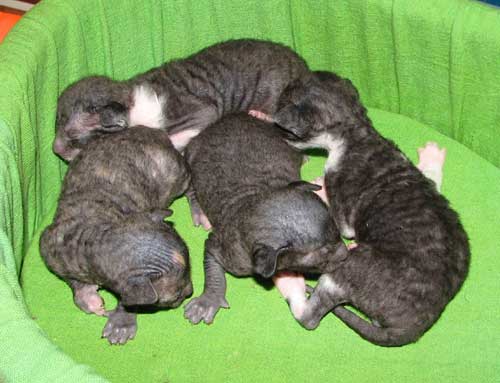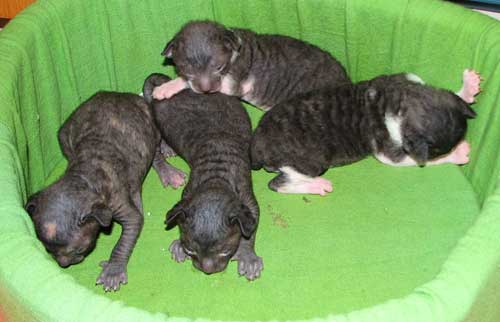 Rytmiksen ja Reiskan pennut, syntyneet 23.7.2006. Kuvat otettu 2.8.2006, joten pennut ovat 1,5 viikkoa.