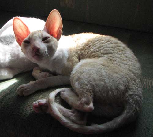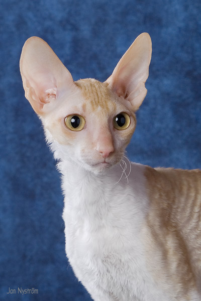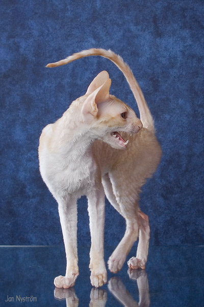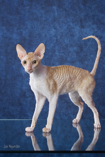 Ilonan ja Sandy upeasta kuusikosta meille muutti punavalkea pikkuneiti Safron. Hän on aikamoisen tempperamenttinen pikkuneiti, jolla ei ollut lainkaan ongelmia tulla asumaan meidän kissojen ja koirien seuraan. Safron on ensimmäinen suomalainen cornish rex naaras joka saavutti Supreme Champion tittelin. Saffy on kolmen pentueen äiti ja tyttärineen hän nykyään määrää kaapin paikkaa meidän muille kissoille. |